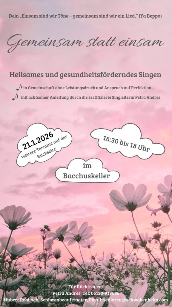 GEMEINSAM STATT EINSAM – heilsames und gesundheitsförderndes Singen am 21.1.26 von 16:30 bis 18 Uhr im Bacchuskeller